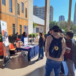Nuestra carrera estuvo representada en los Campus de Casa Central y San Joaquín, donde dispusimos de un stand atendido por dos equipos de estudiantes: Victoria Chamorro y Paul Villalobos en San Joaquín, y Francisca Álvarez y Camila Díaz en Casa Central.