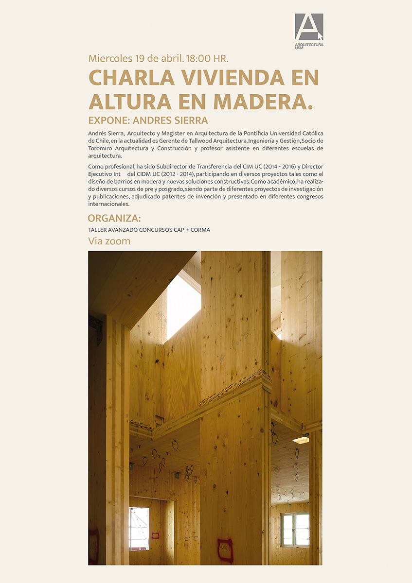 Nuestro Taller Avanzado de Concursos invita a la charla: Vivienda en altura en madera, a realizarse este miércoles 19 de abril a las 18:00 hrs vía zoom por Andrés Sierra, Arquitecto y Magister en Arquitectura de la Pontificia Universidad Católica de Chile, en la actualidad es Gerente de Tallwood Arquitectura, Ingeniería y Gestión, Socio de Toromiro Arquitectura y Construcción y profesor asistente en diferentes escuelas de arquitectura.