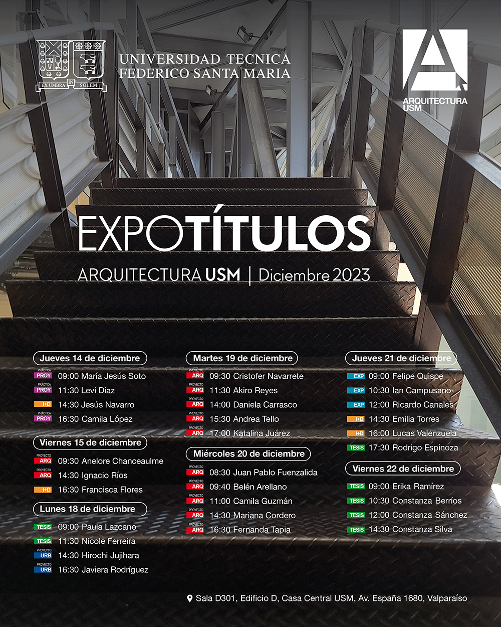 afiche-titulos-arqUSM-diciembre-2023Nuestro Departamento de Arquitectura se complace en invitarles al evento de Exámenes de Título que se realizarán entre el 14 y el 22 de diciembre de 2023, en la cual 31 estudiantes de nuestra carrera expondrán sus procesos de título ante las comisiones conformadas por profesores/as de nuestro Departamento e invitados/as externos.