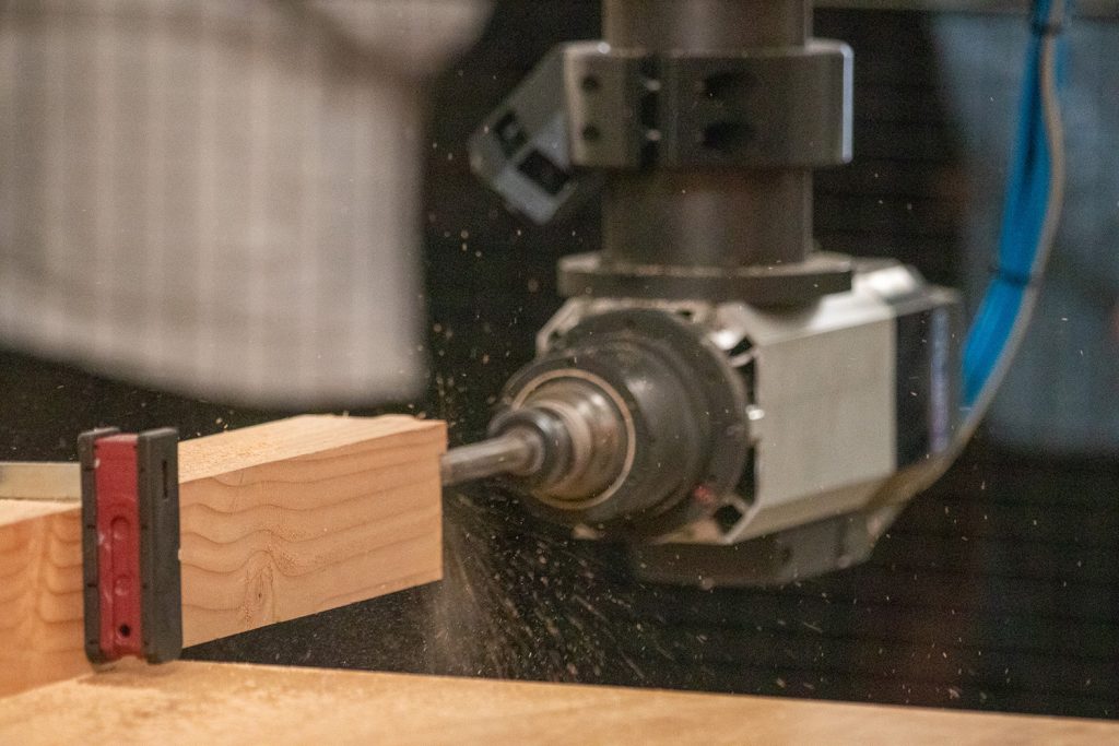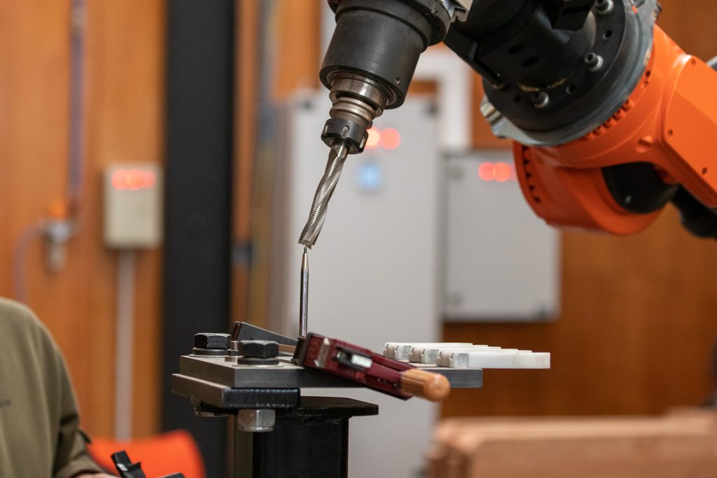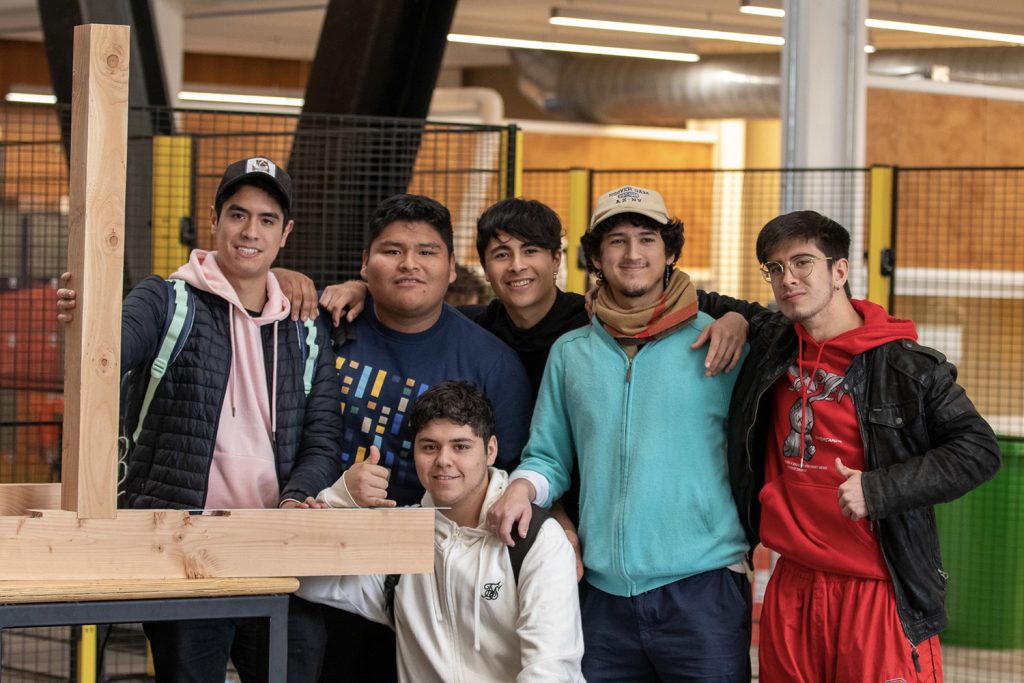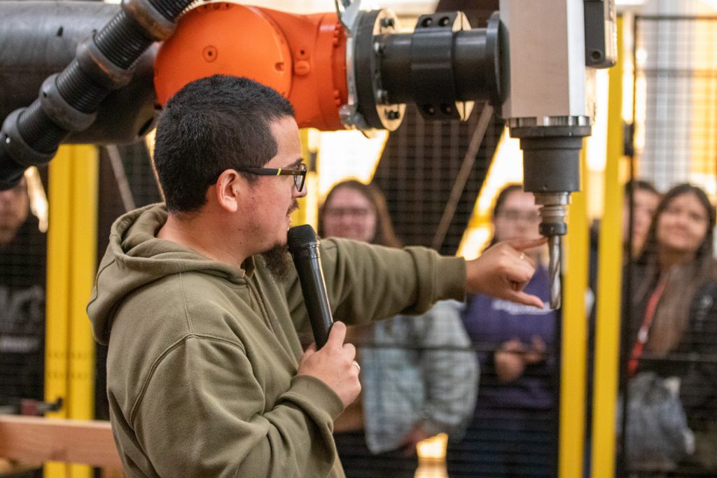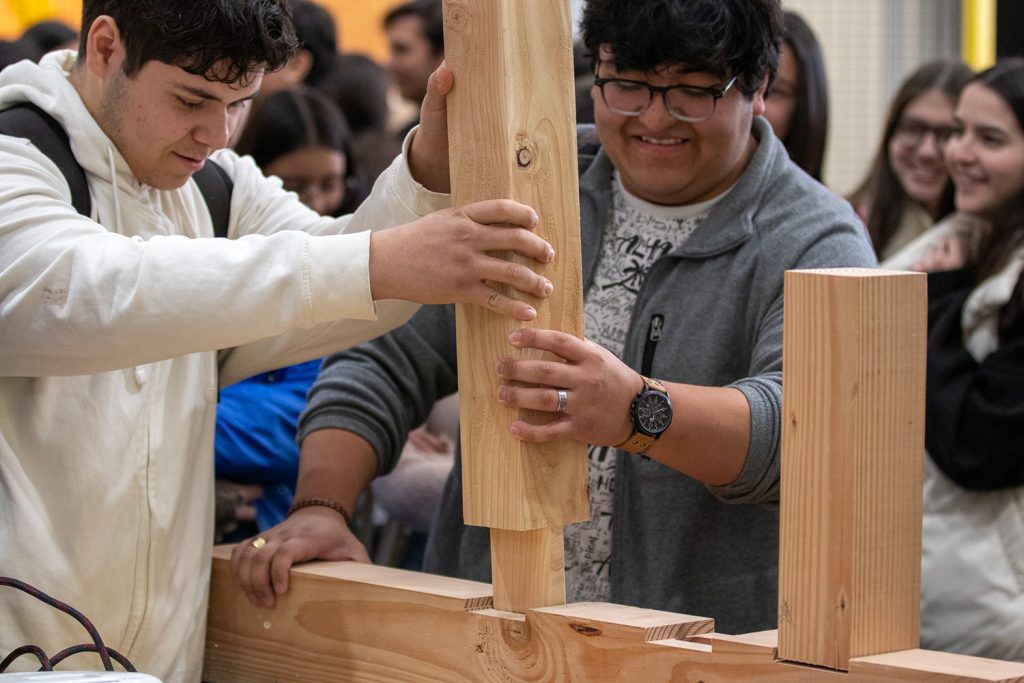 La actividad culminó con el workshop “Carpintería de armar robotizada”, realizado en el Laboratorio de Construcción y Manufactura Robotizada del Campus Santiago San Joaquín. Durante este taller, las y los estudiantes trabajaron en el diseño paramétrico de uniones carpinteras y programaron trayectorias para el robot KUKA Quantec KR 210 R3100-2 C, con el objetivo de mecanizar una espiga de madera que posteriormente ensamblaron en una caja mecanizada.