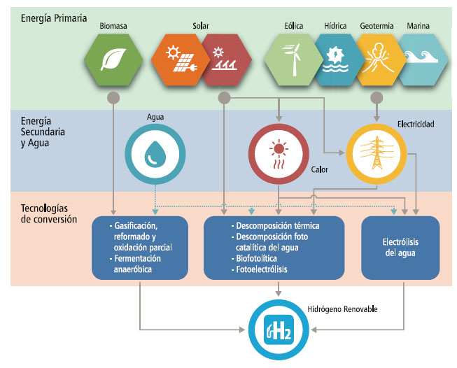Esquema de ruta de producción de Hidrógeno renovable. Fuente: Tecnologías del Hidrógeno y perspectivas para Chile. GIZ + Ministerio de Energía, 2019.