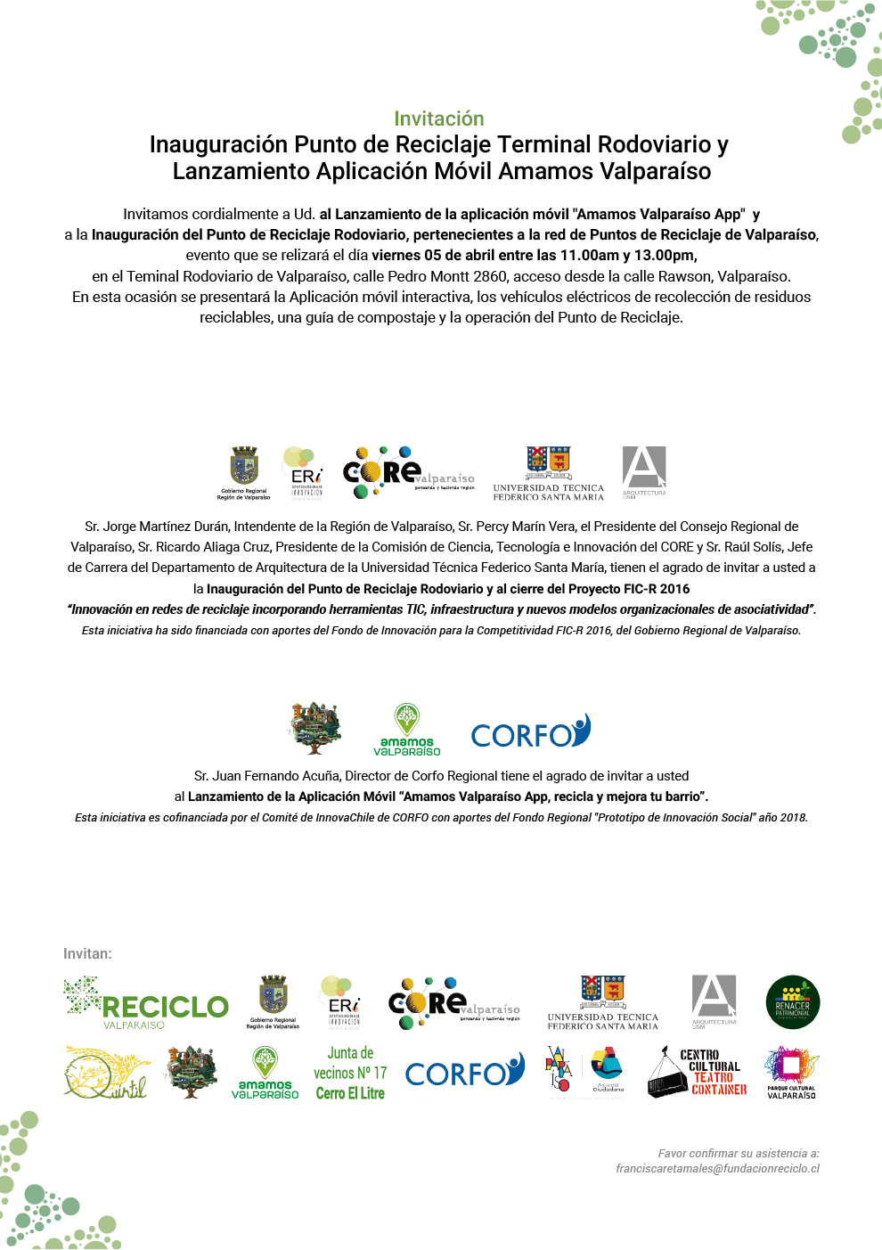 El Intendente Regional Sr. Jorge Martínez Durán, el Presidente del Consejo Regional de Valparaíso Sr. Percy Marín Vera, el Presidente de la Comisión de Ciencia, Tecnología e Innovación del CORE Sr. Ricardo Aliaga Cruz, el Jefe de Carrera del Departamento de Arquitectura USM, Sr. Raúl Solís, Fundación Reciclo, Cooperativa Renacer Patrimonial, Asociación Parque Quintil, Parque Cultural de Valparaíso, CORFO, Amamos Valparaíso y las organizaciones participes de este proyecto invitan cordialmente a la comunidad a la Inauguración de la red de puntos de reciclaje de Valparaíso, que contará con diversas actividades entre marzo y abril de 2019.