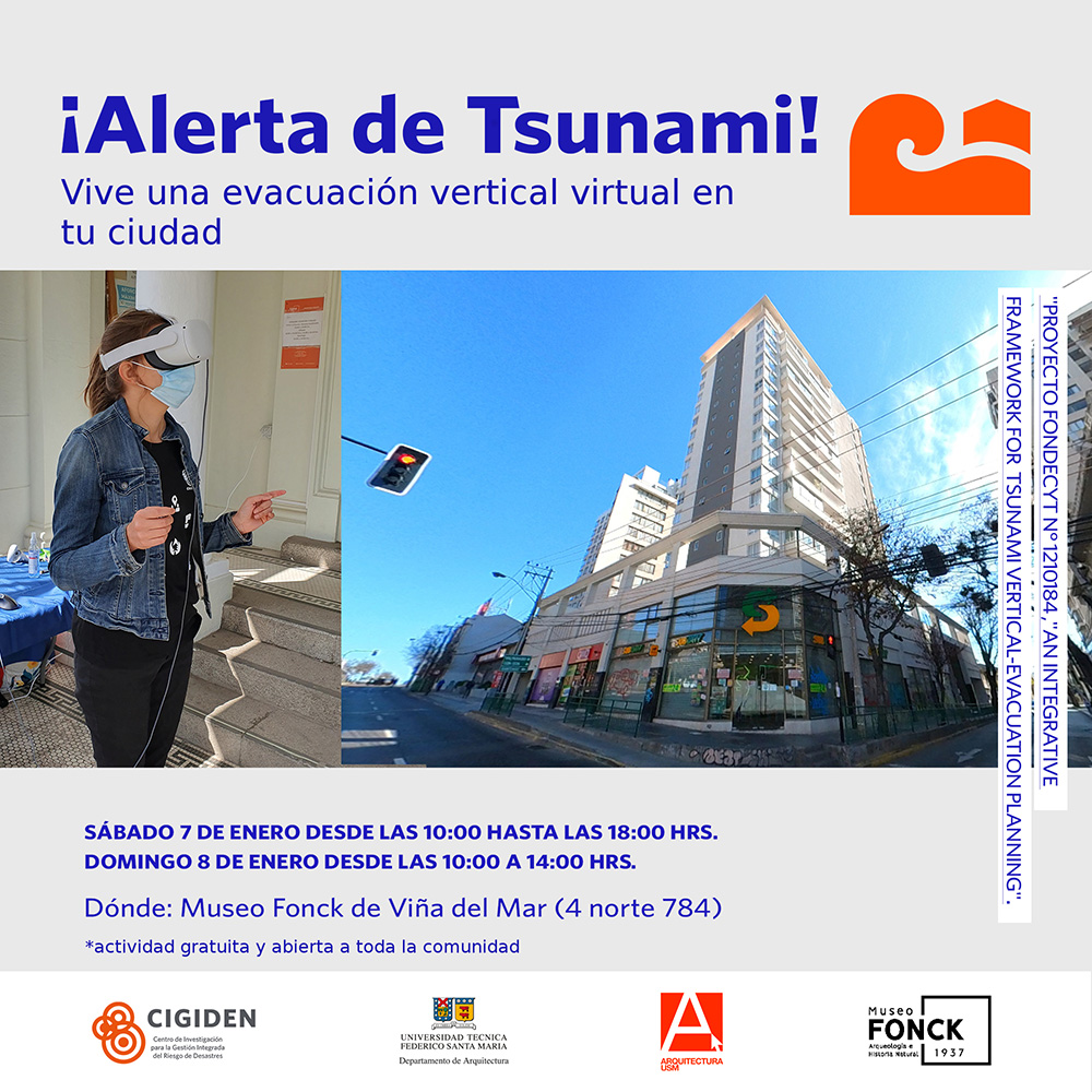 En el marco del proyecto de investigación Fondecyt nº 1210184: “An integrative framework for tsunami vertical-evacuation planning”, se invita a toda la comunidad del Departamento de Arquitectura a participar de una experiencia de realidad virtual inmersiva para simular procesos de evacuación vertical por tsunami en la ciudad de Viña del Mar.