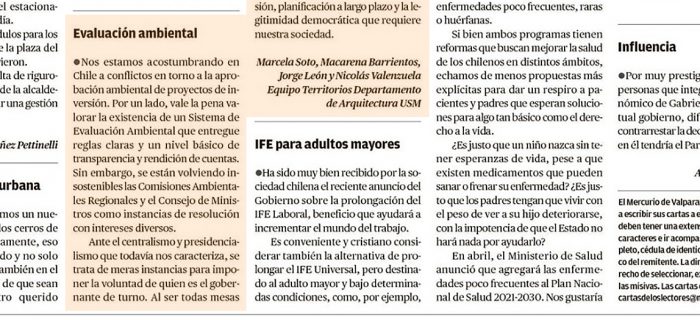 El Mercurio de Valparaíso y La Tercera publican carta sobre el Sistema de Evaluación Ambiental enviada por el Área Territorio