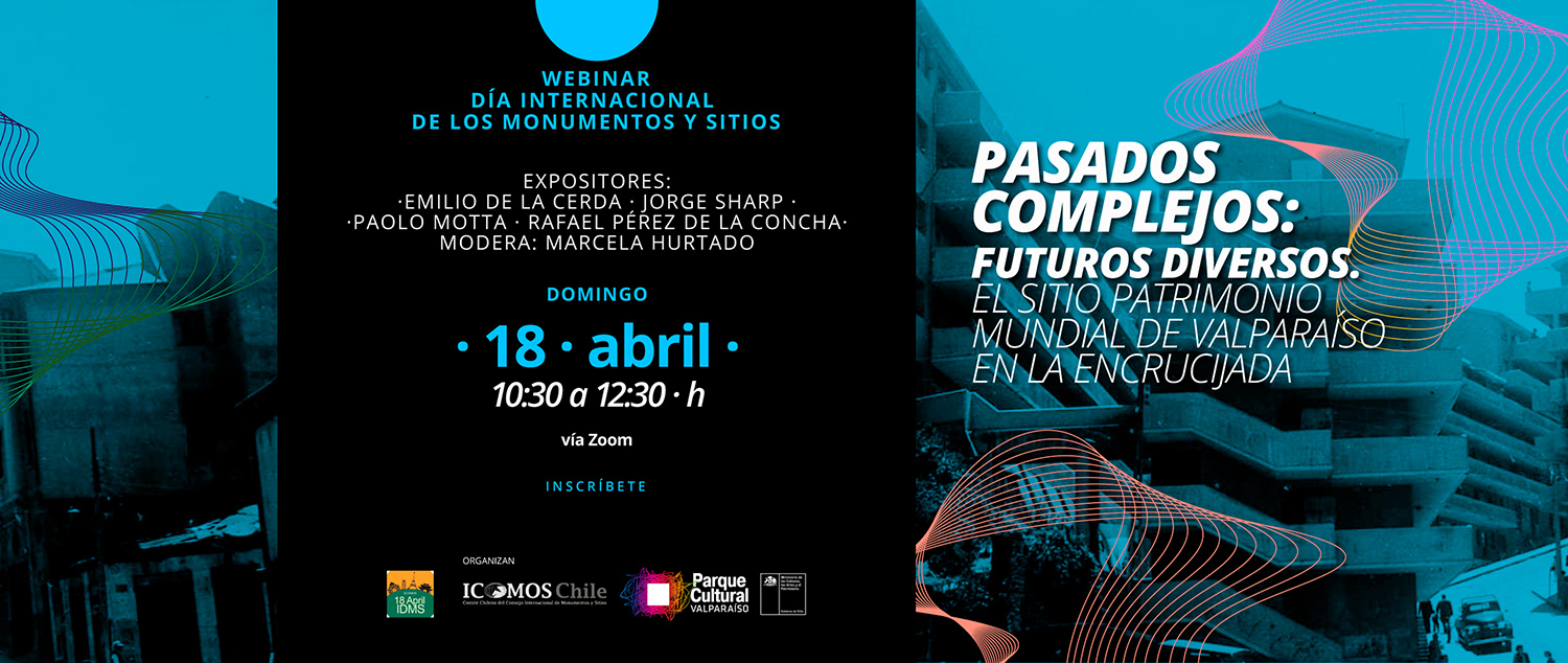 webinar-icomos2021ICOMOS Chile, a través de su Presidenta y académica de nuestro Departamento, la Dra. Marcela Hurtado, invita a celebrar el Día Internacional de los Monumentos y Sitios asistiendo al webinar: Pasados complejos: futuros diversos. El Sitio Patrimonio Mundial de Valparaíso en la encrucijada.
