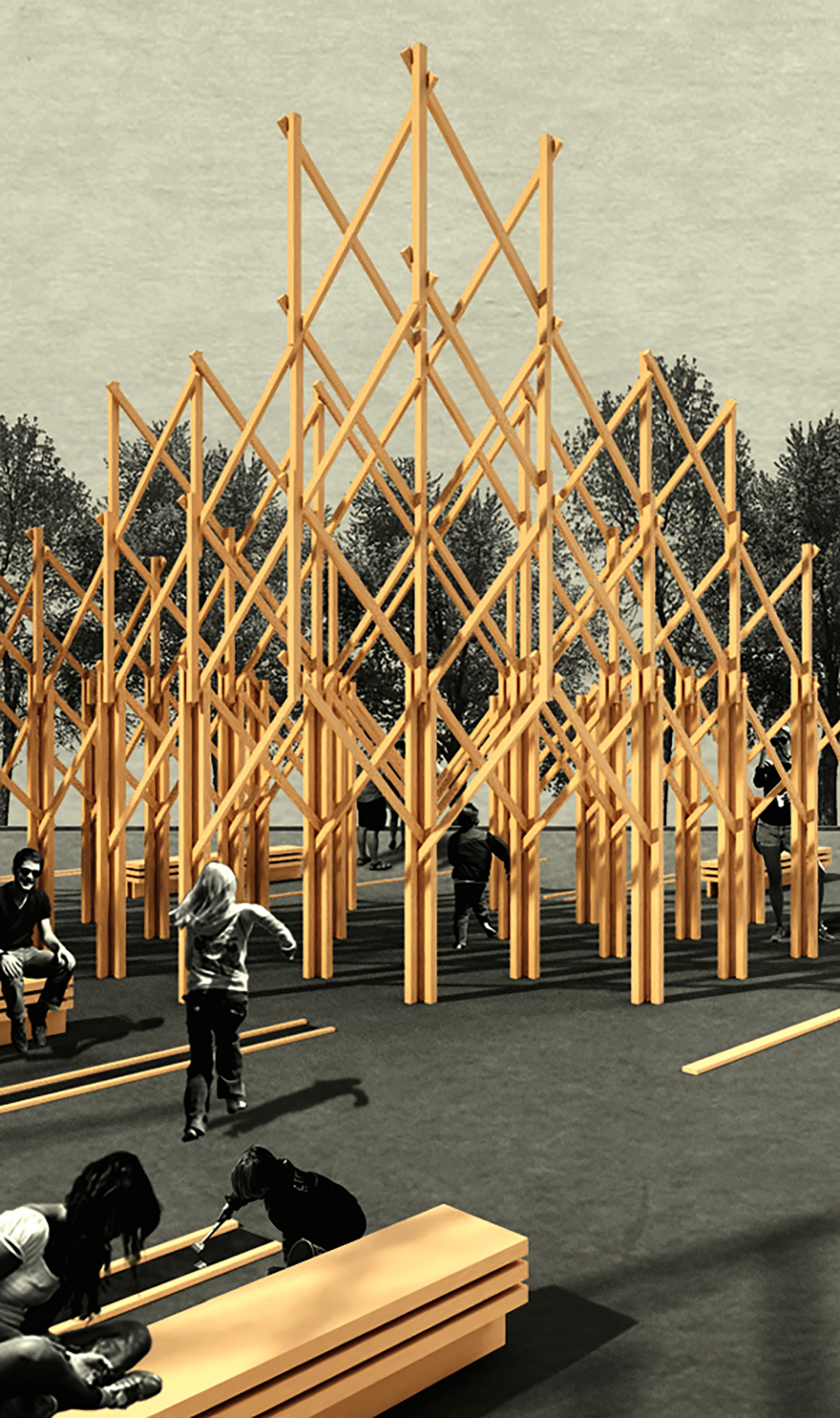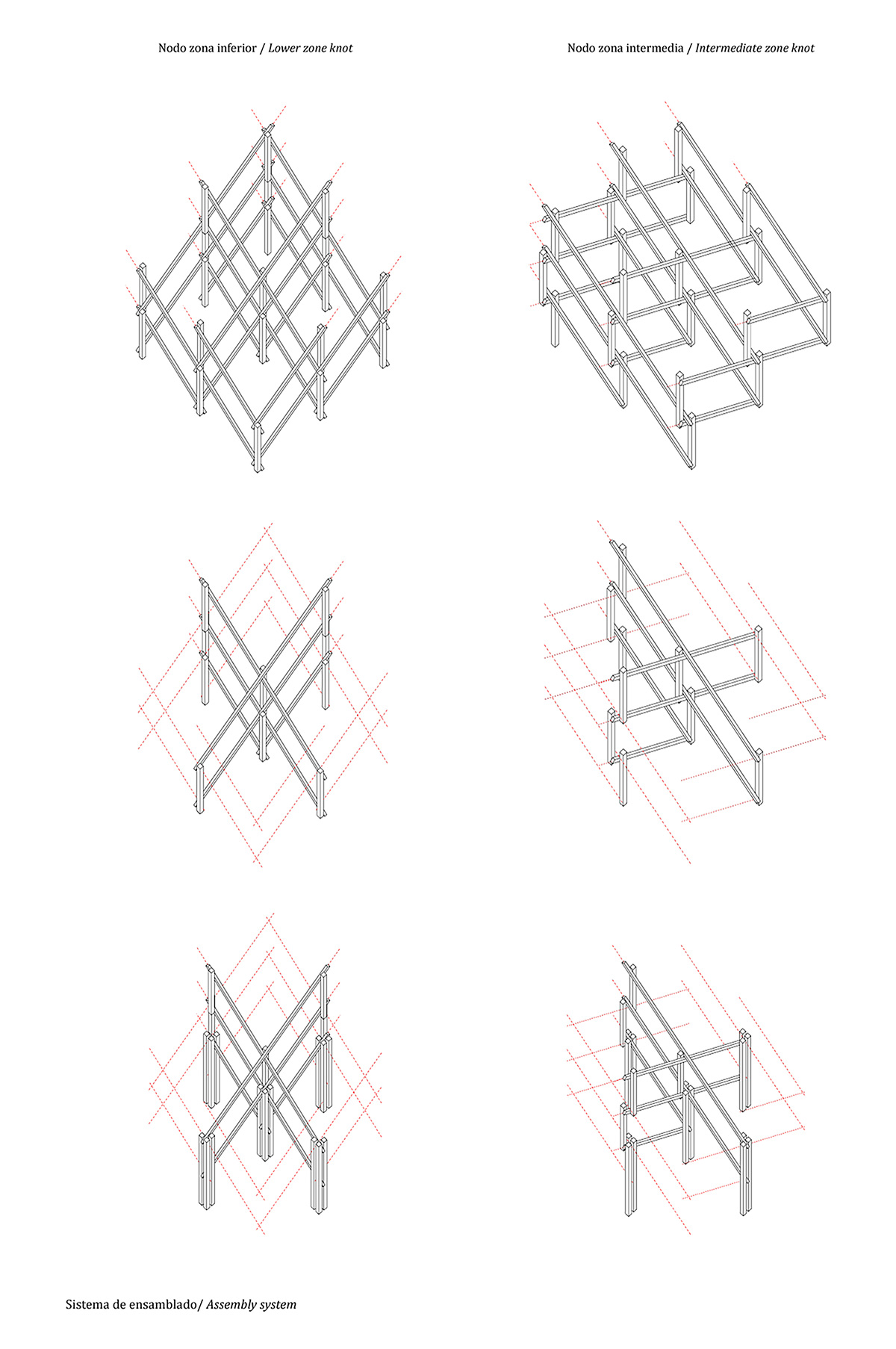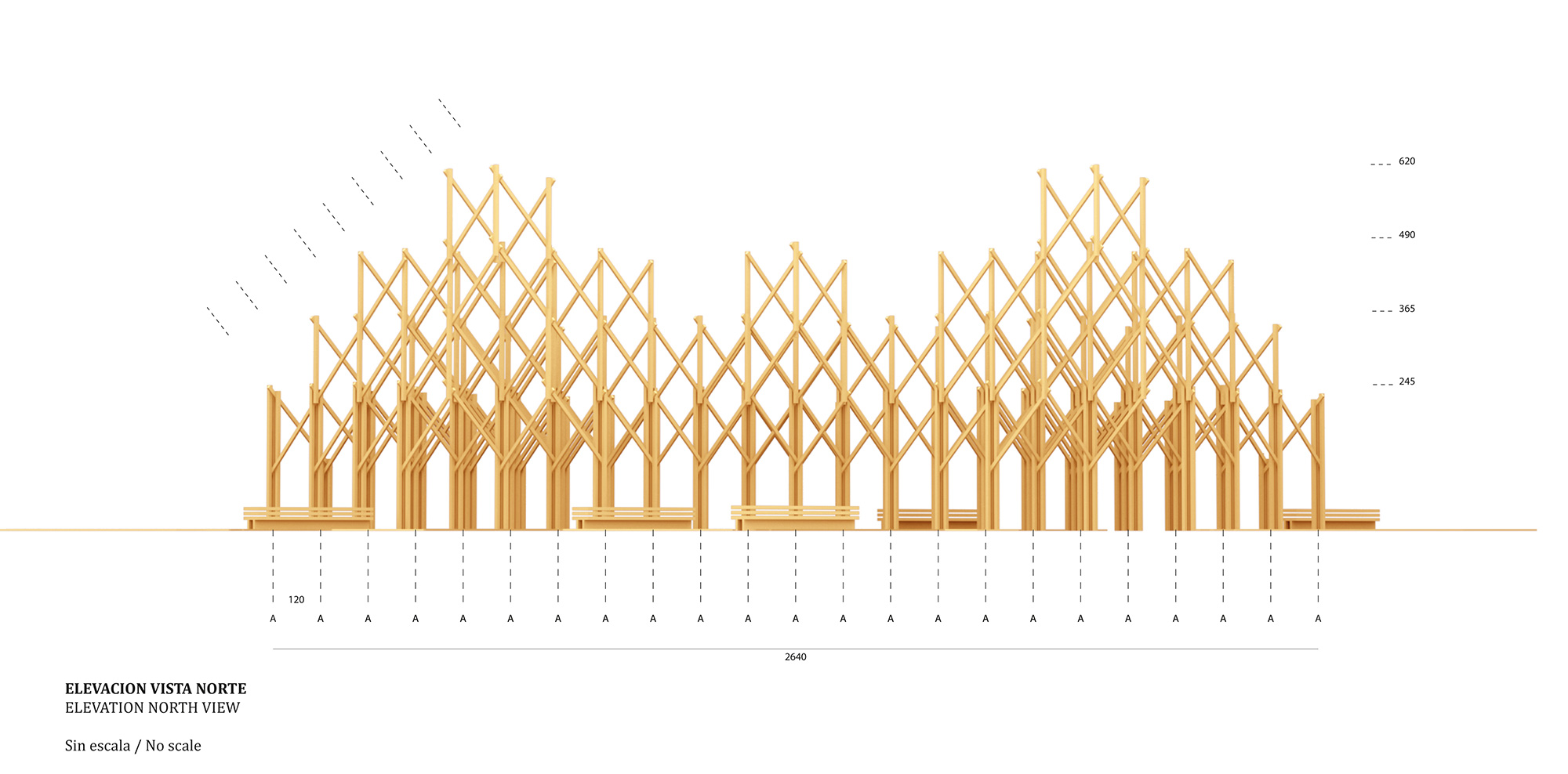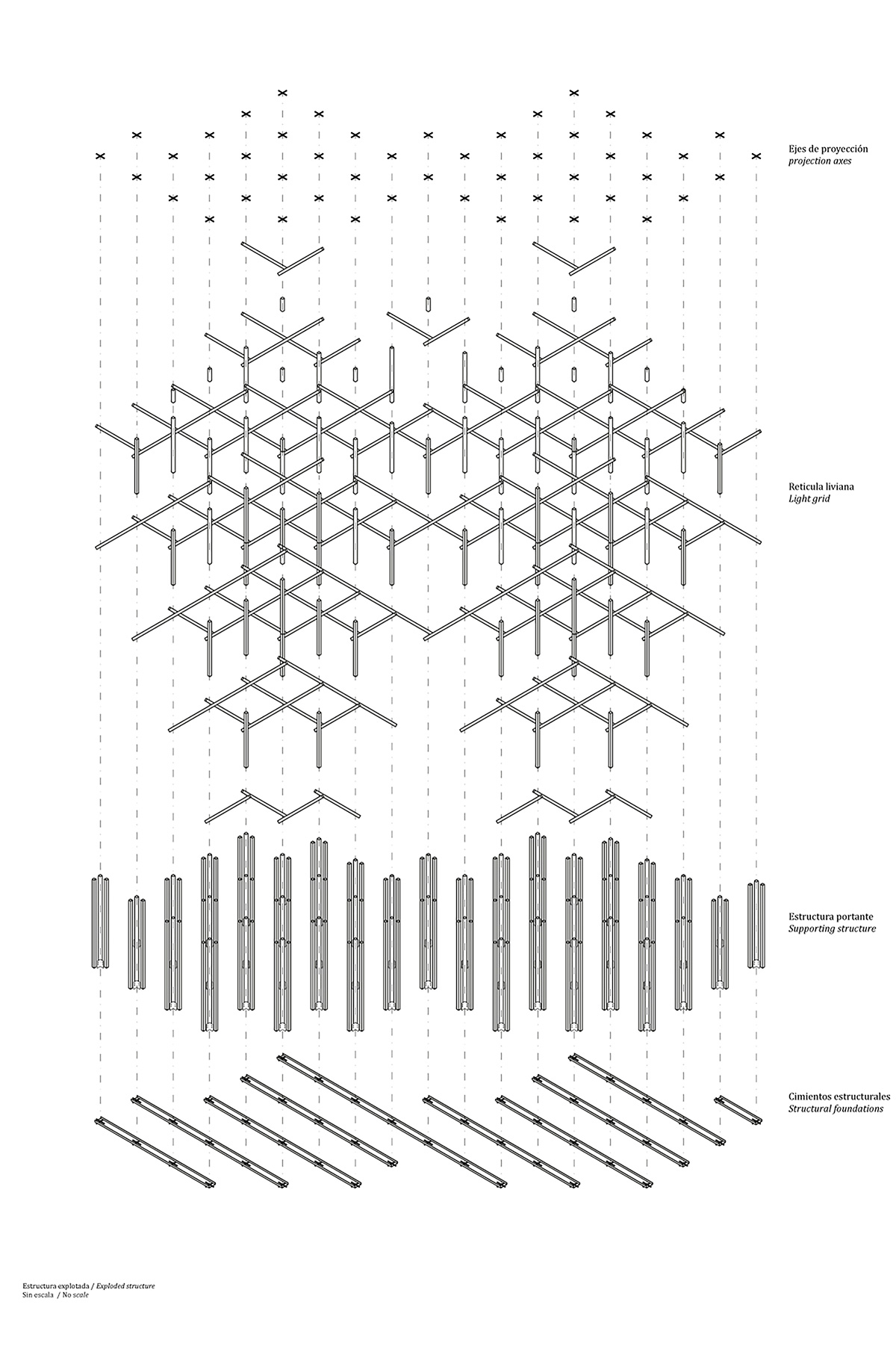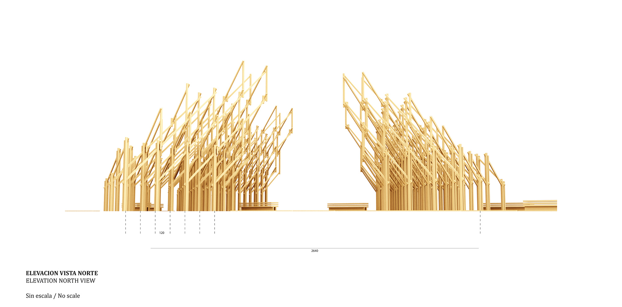La propuesta de Dum Dum Lab planteó una retícula de madera que permitiera al espectador descubrir las distintas proyecciones y densidades desde el interior del pabellón, escondiendo la naturaleza simple y discreta de su secuencia, mediante un patrón sistemático y deliberado de repeticiones que tienden a desdibujar y superponer una serie de perspectivas fugadas en las vistas internas del espectador. La apuesta mono-material hace un uso casi exclusivo de la madera para generar soportes mobiliarios, juegos de agua y los volúmenes entramados que generan el pabellón central.