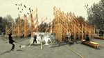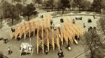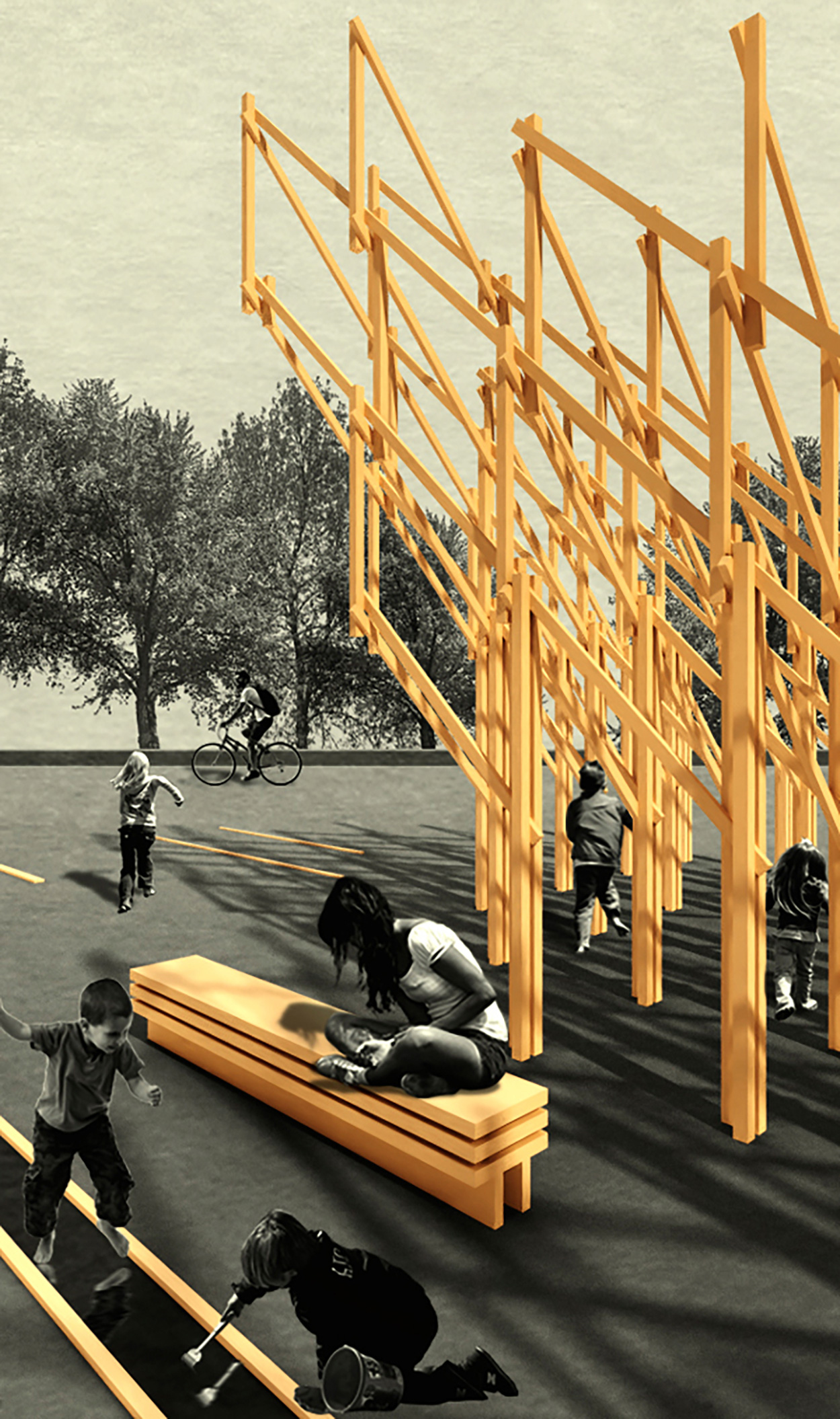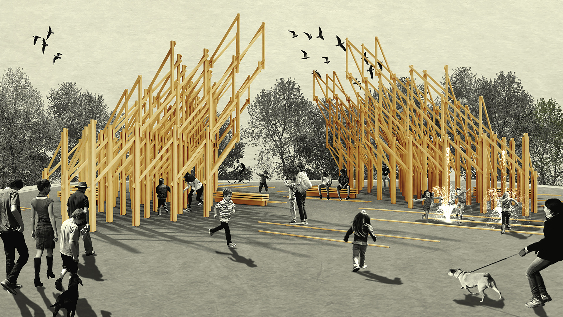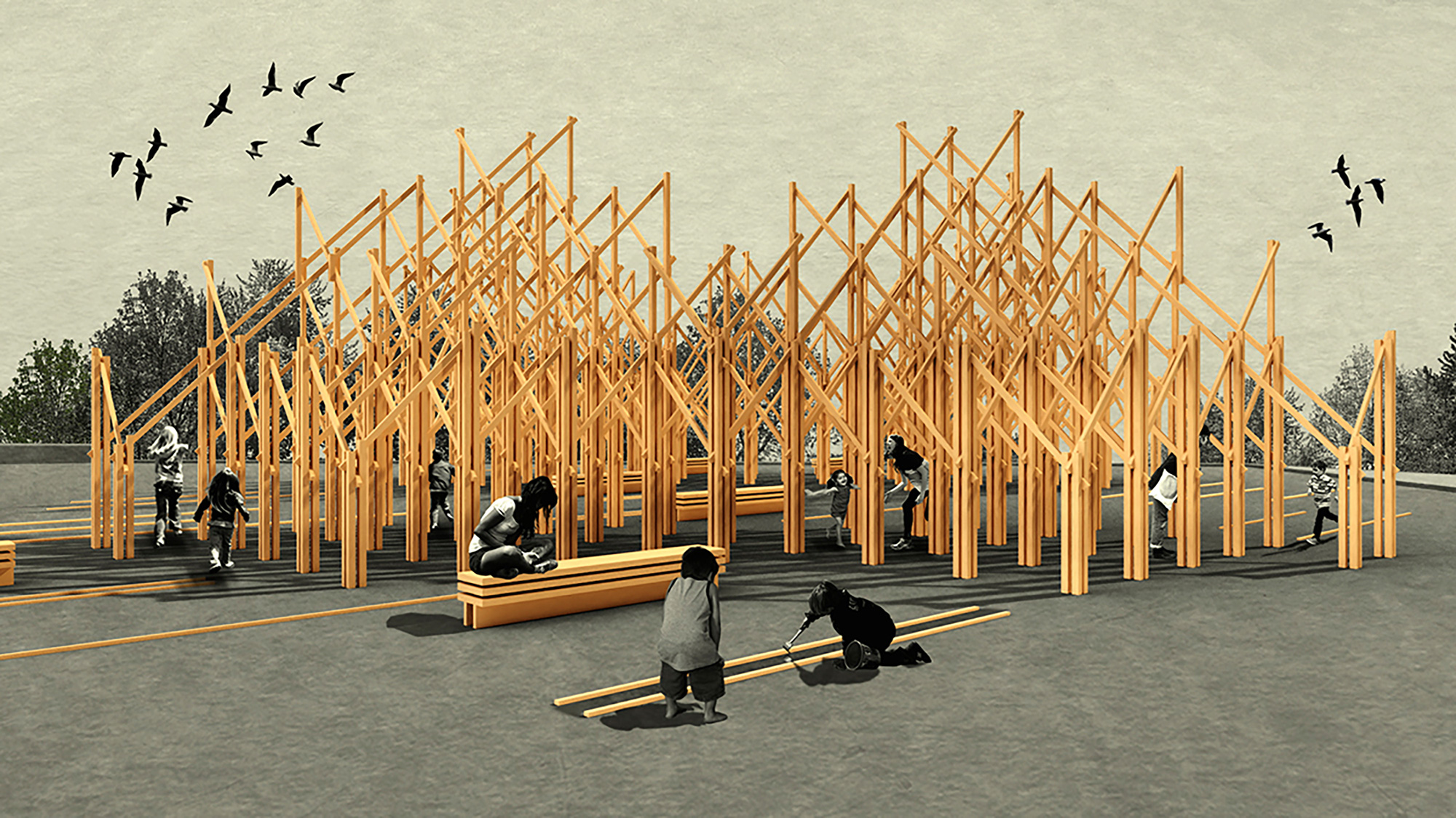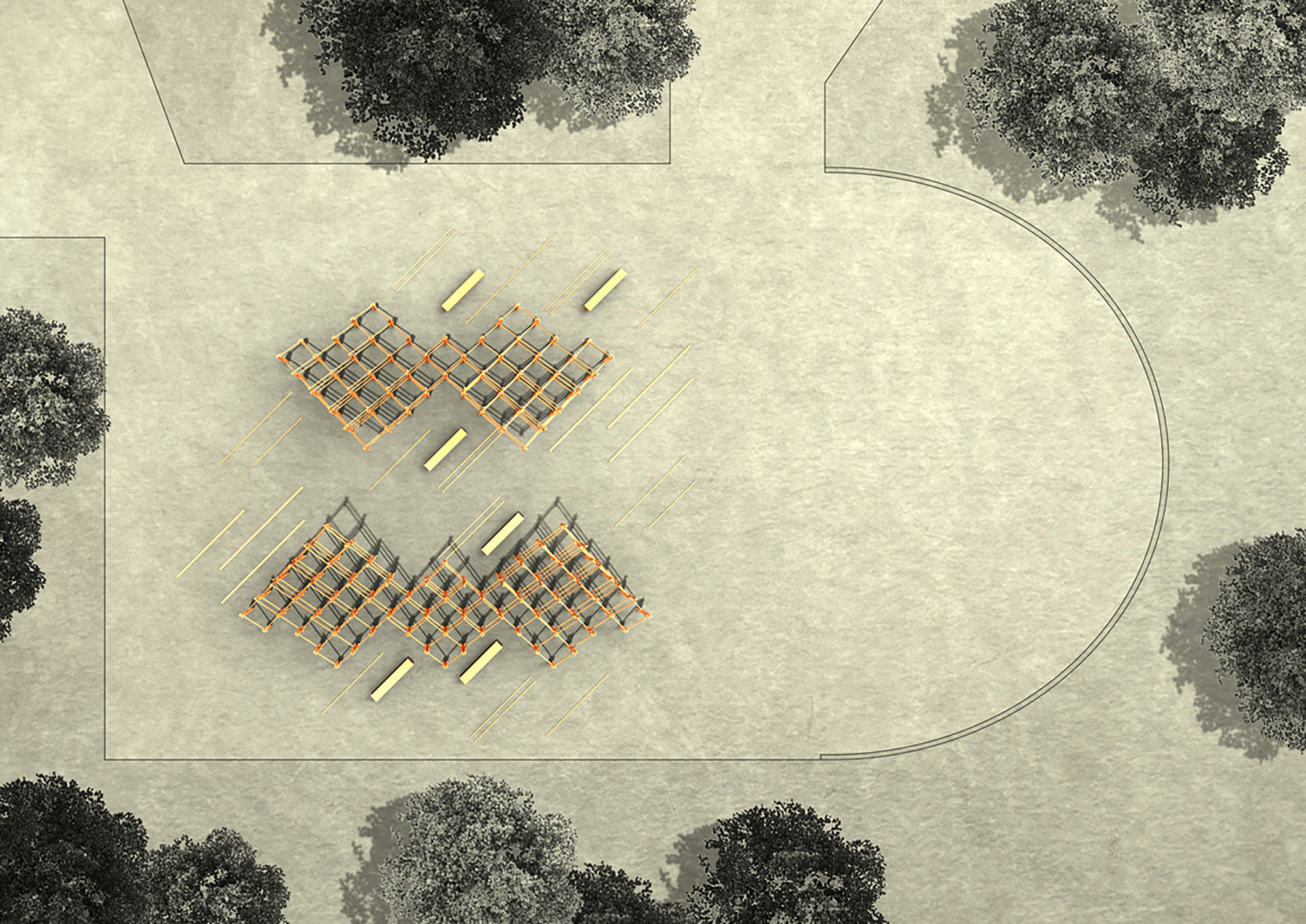 La propuesta de Dum Dum Lab planteó una retícula de madera que permitiera al espectador descubrir las distintas proyecciones y densidades desde el interior del pabellón, escondiendo la naturaleza simple y discreta de su secuencia, mediante un patrón sistemático y deliberado de repeticiones que tienden a desdibujar y superponer una serie de perspectivas fugadas en las vistas internas del espectador. La apuesta mono-material hace un uso casi exclusivo de la madera para generar soportes mobiliarios, juegos de agua y los volúmenes entramados que generan el pabellón central.
