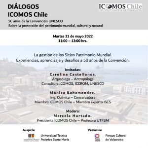 En el marco de los 50 años de la redacción de la Convención UNESCO sobre la Protección del Patrimonio Mundial, Cultural y Natural, el Comité chileno del Consejo Internacional de Monumentos y Sitios, ICOMOS Chile, ha organizado una serie de DIÁLOGOS, con la participación de especialistas nacionales e internacionales.