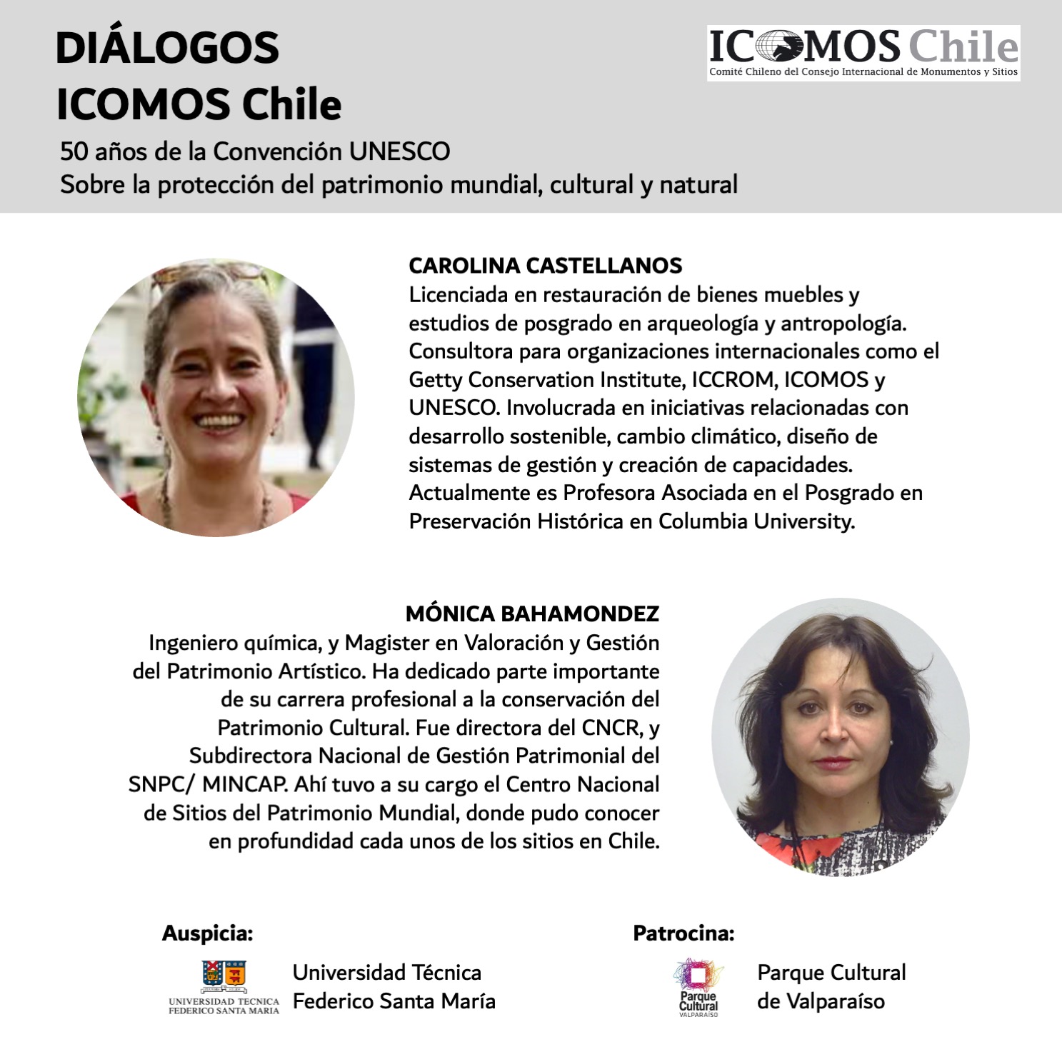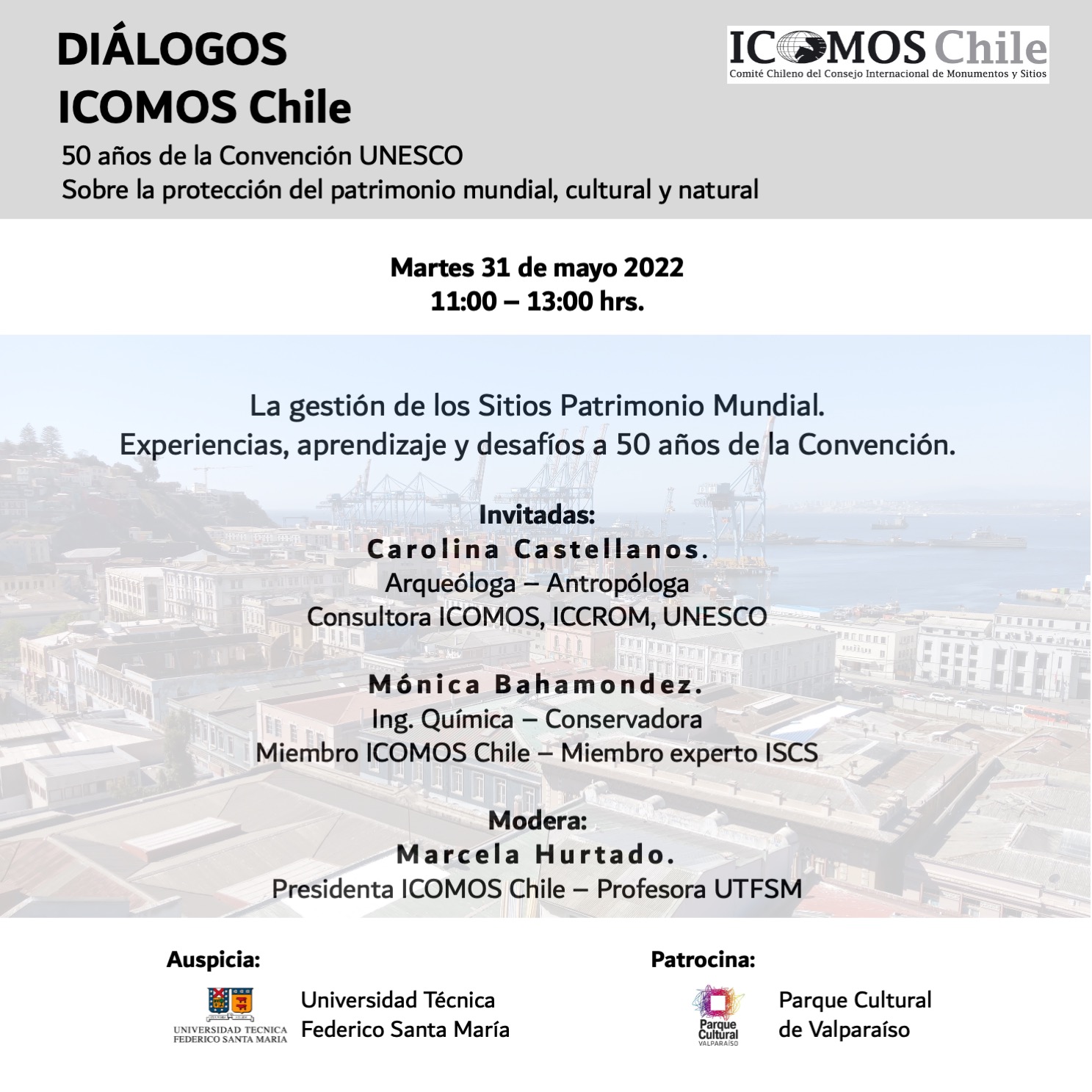 Para el día martes 31 de mayo, entre 11:00 y 13:00 hrs, está programado el primer DIÁLOGO: La gestión de los Sitios Patrimonio Mundial. Experiencias, aprendizaje y desafíos a 50 años de la Convención. Las invitadas son Carolina Castellanos y Mónica Bahamóndez. La moderación está a cargo de la presidenta de ICOMOS Chile, Marcela Hurtado. La actividad se realizará vía Zoom.
